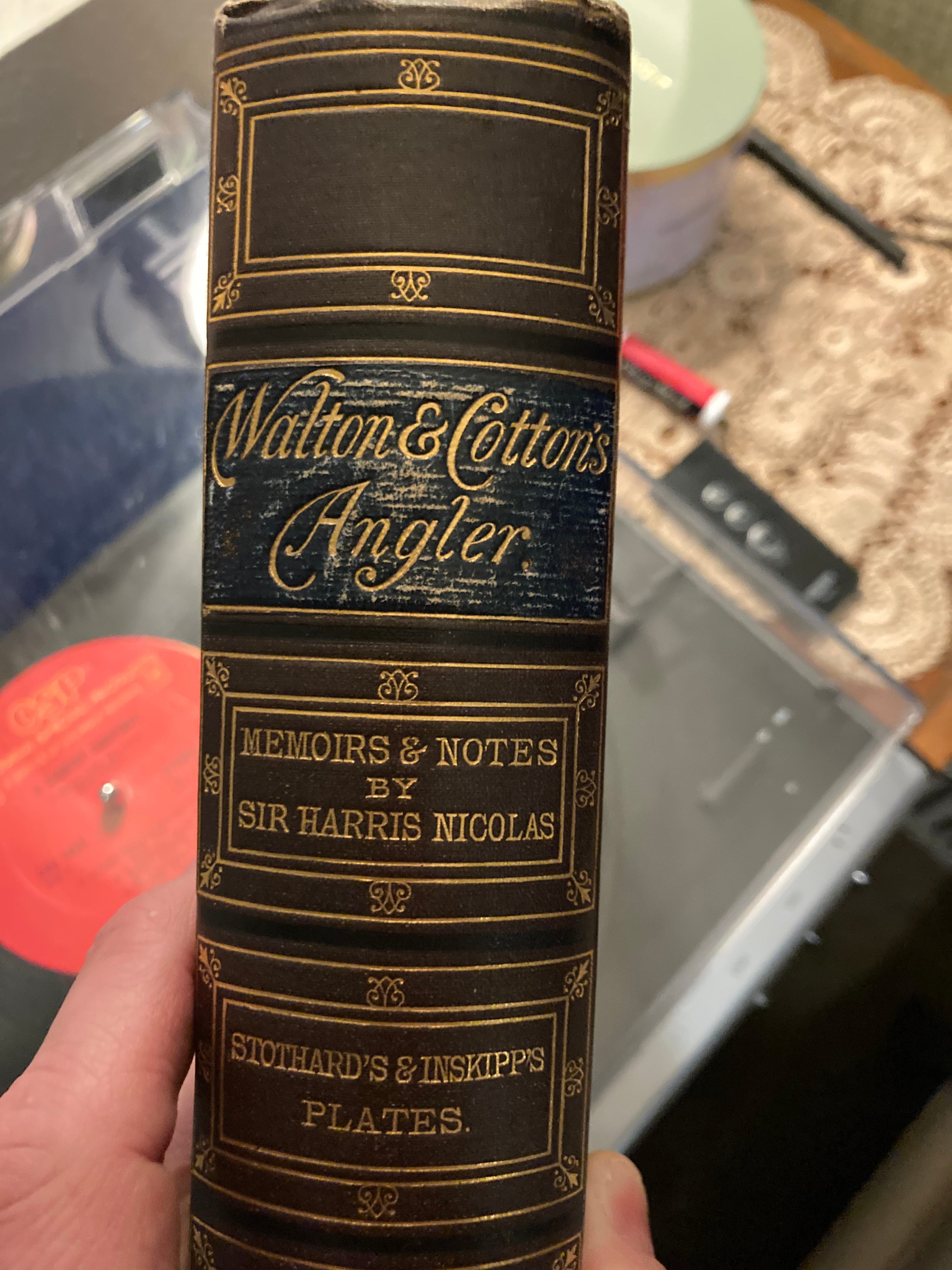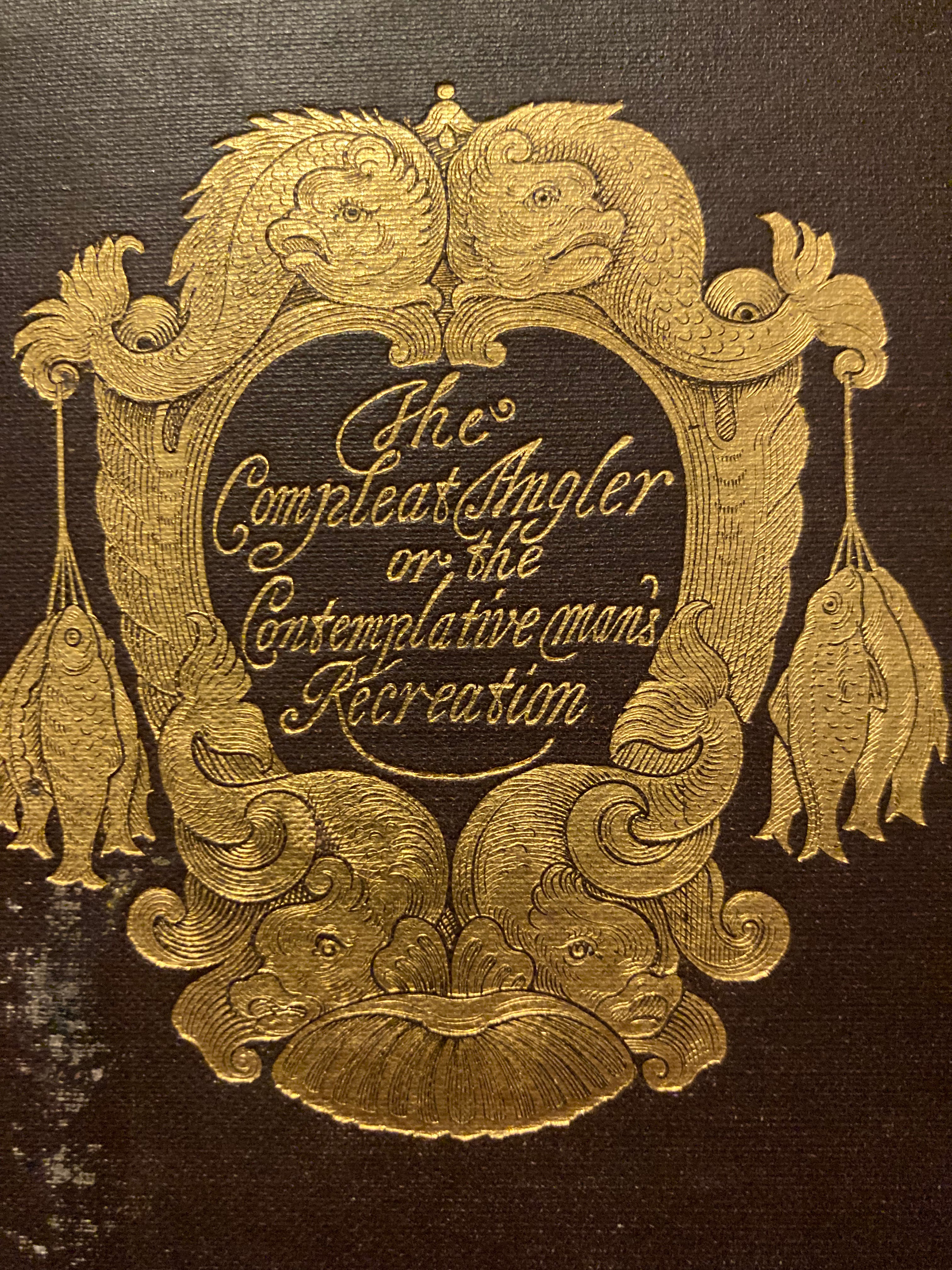 I start with this beauty, gifted to me by my eldest. It is an 1887 copy of The Compleat Angler, compiled by Izaak Walton (1593-1683) and Charles Cotton (1630-1687). You may remember that this year I’d obtained a facsimile of one of their 16th century source books, The Arte of Angling, which didn’t teach me a whole lot about fishing Montana’s blue-ribbon trout streams, but did teach me a lot about English religion and piety in that century.